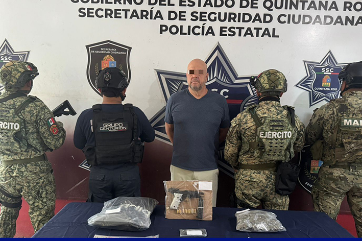 Cancún.- La detención de un objetivo prioritario del atlas delictivo estatal fue confirmada por autoridades de seguridad, tras un operativo realizado en el municipio de Benito Juárez, donde fue asegurado Remigio “N”, presunto implicado en delitos contra la salud y portación de arma de fuego de uso exclusivo del Ejército.