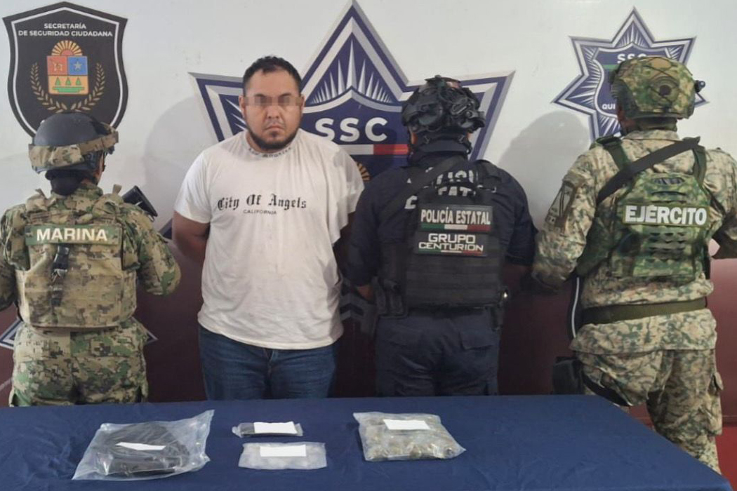 Cancún.-Elementos del Grupo Centurión de la Secretaría de Seguridad Ciudadana, en coordinación con la Secretaría de Marina y la Secretaría de la Defensa Nacional, realizaron la detención de Marco Antonio “N”, presunto implicado en delitos contra la salud, en el municipio de Benito Juárez.