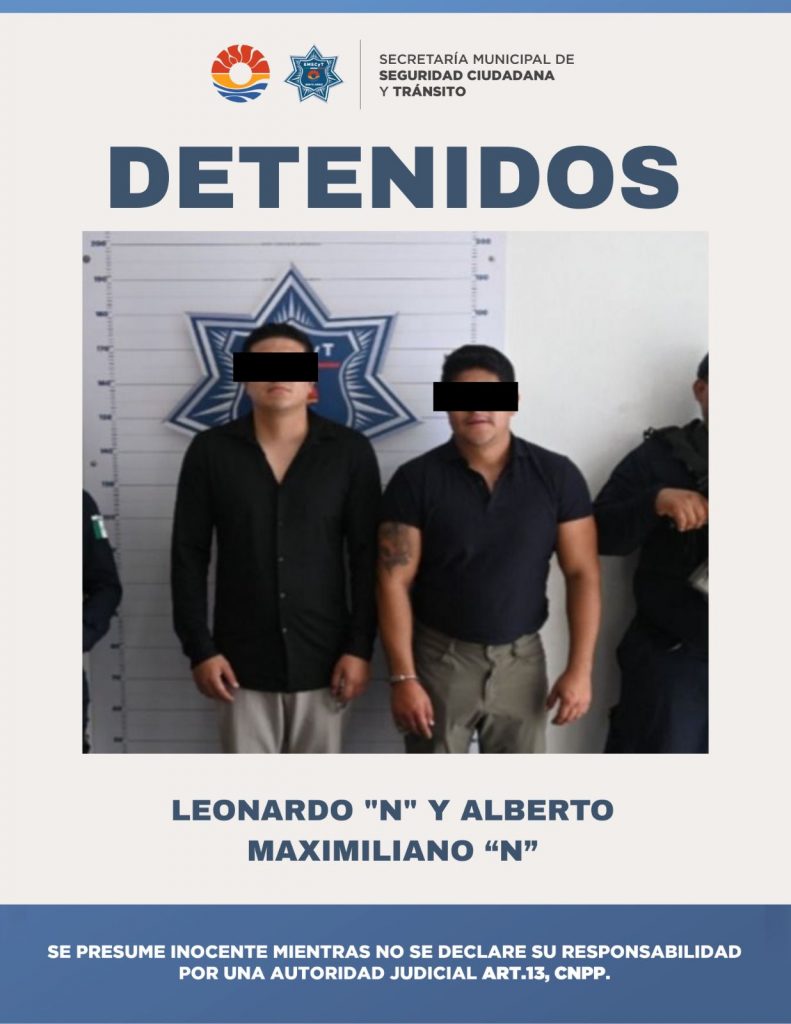 Los detenidos fueron identificados como Leonardo “N”, de 29 años, y Alberto Maximiliano “N”, de 31 años, ambos originarios de la Ciudad de México. Fueron puestos a disposición de la autoridad competente, donde se determinará su situación jurídica conforme a la ley.