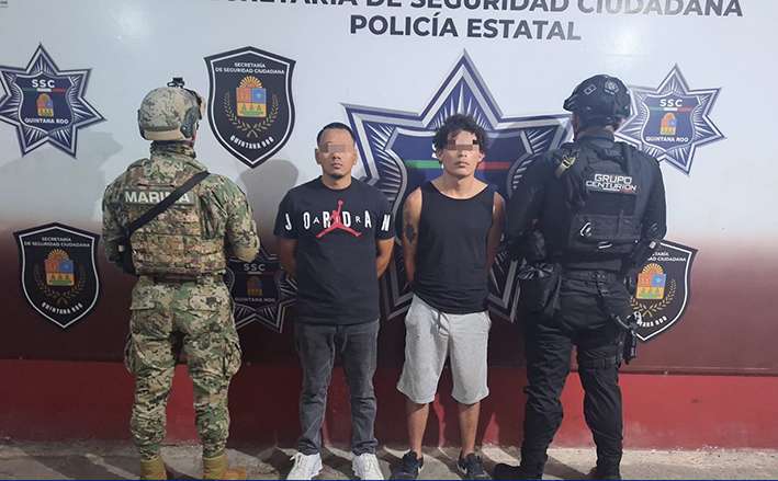 Cancún.- Elementos del Grupo Centurión de la Secretaría de Seguridad Ciudadana, en coordinación con personal de la Secretaría de Marina, realizaron la detención de Roger Saúl “N”, alias “Garabato”, y Eddy Mauricio “N”, presuntamente implicados en los delitos contra la seguridad del tránsito de vehículos, así como desobediencia y resistencia de particulares.