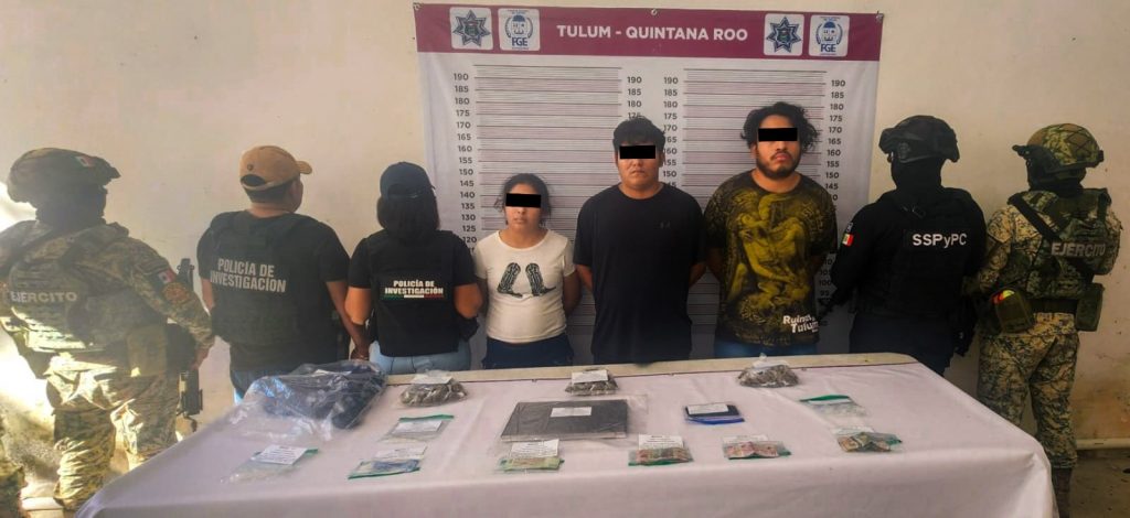 Tulum,. Elementos de la Policía de Investigación de la Fiscalía General del Estado, en coordinación con personal de la Secretaría de la Defensa Nacional y la Secretaría de Seguridad Ciudadana Municipal, detuvieron en flagrancia a dos hombres y una mujer por su presunta relación en delitos contra la salud, en la modalidad de narcomenudeo, en Tulum.