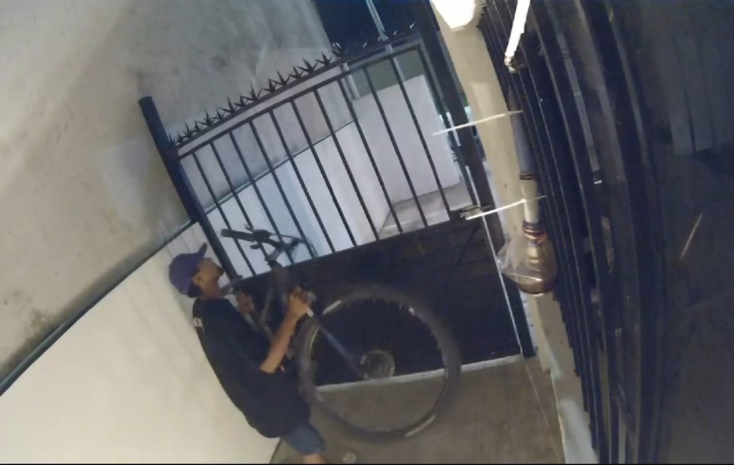 Minutos después, las cámaras capturaron al ladrón retirando una bicicleta de montaña, que colocó cerca de la reja antes de cargarla y llevarse. A pesar de su aparente tranquilidad durante el robo, el sujeto no se dio cuenta de que estaba siendo grabado en todo momento, lo que facilitará su identificación por parte de las autoridades.
