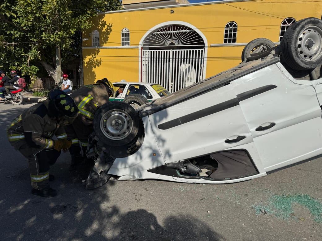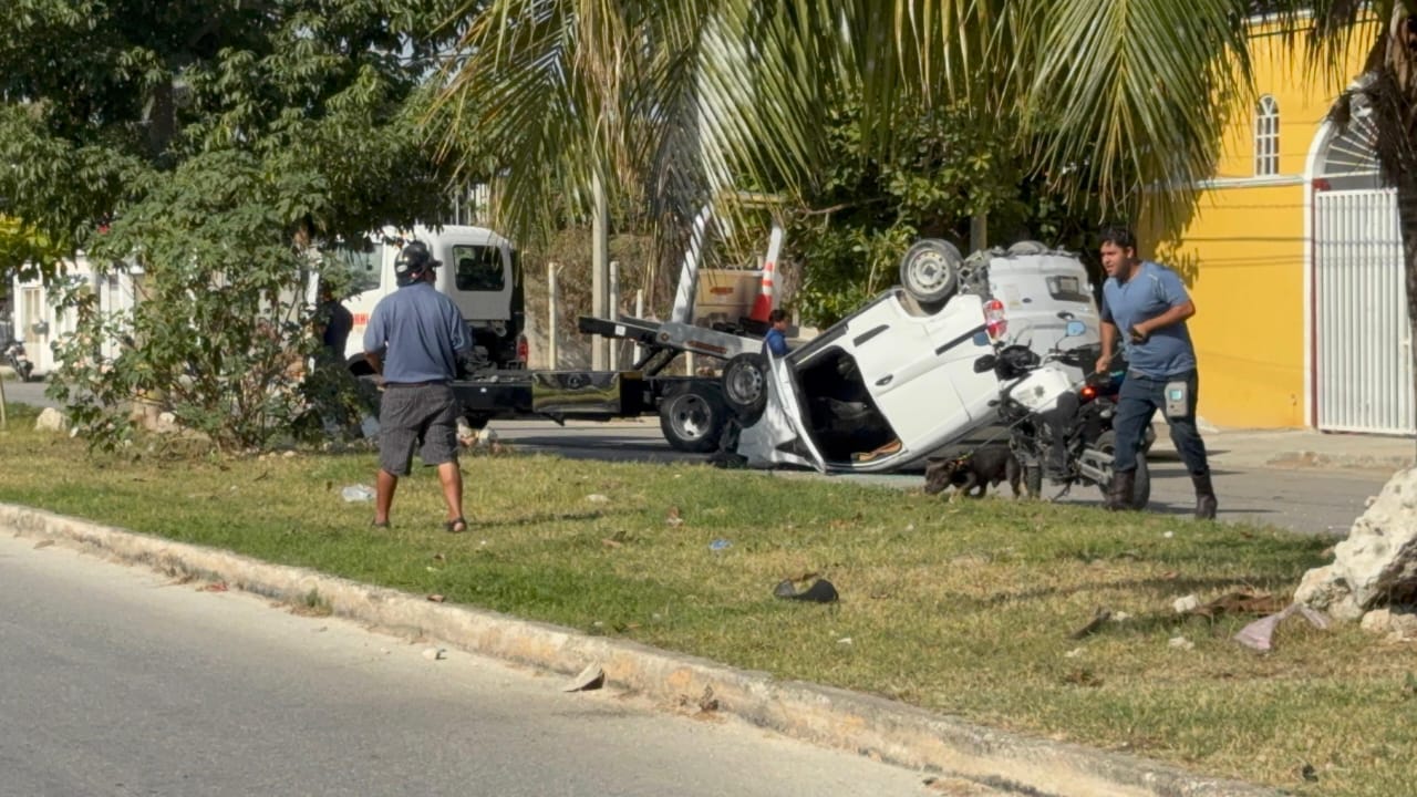 Cancún.- Un choque entre tres vehículos dejó como saldo tres personas lesionadas, una unidad volcada y cuantiosos daños materiales en el cruce de las avenidas Centenario y Payo Obispo, en la región 227 de Cancún.
