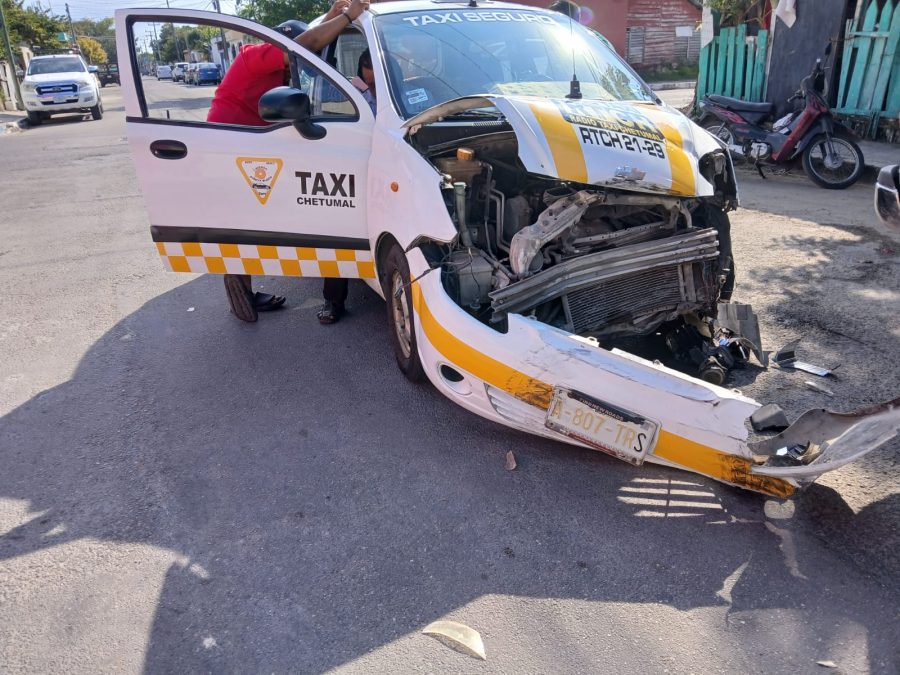 De acuerdo con datos extraoficiales, el taxi circulaba con preferencia de paso cuando se impactó contra la camioneta, al servicio del Tren Maya, cuya conductora se voló el alto.