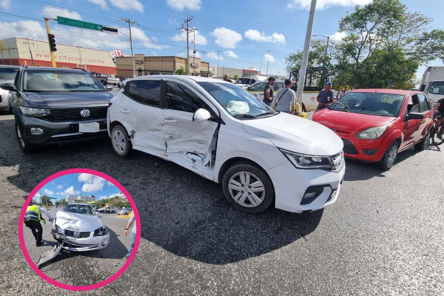Choque múltiple en Av. Andrés Quintana Roo deja 2 lesionados y 4 autos dañados. Un conductor ignoró la luz roja y provocó el accidente.