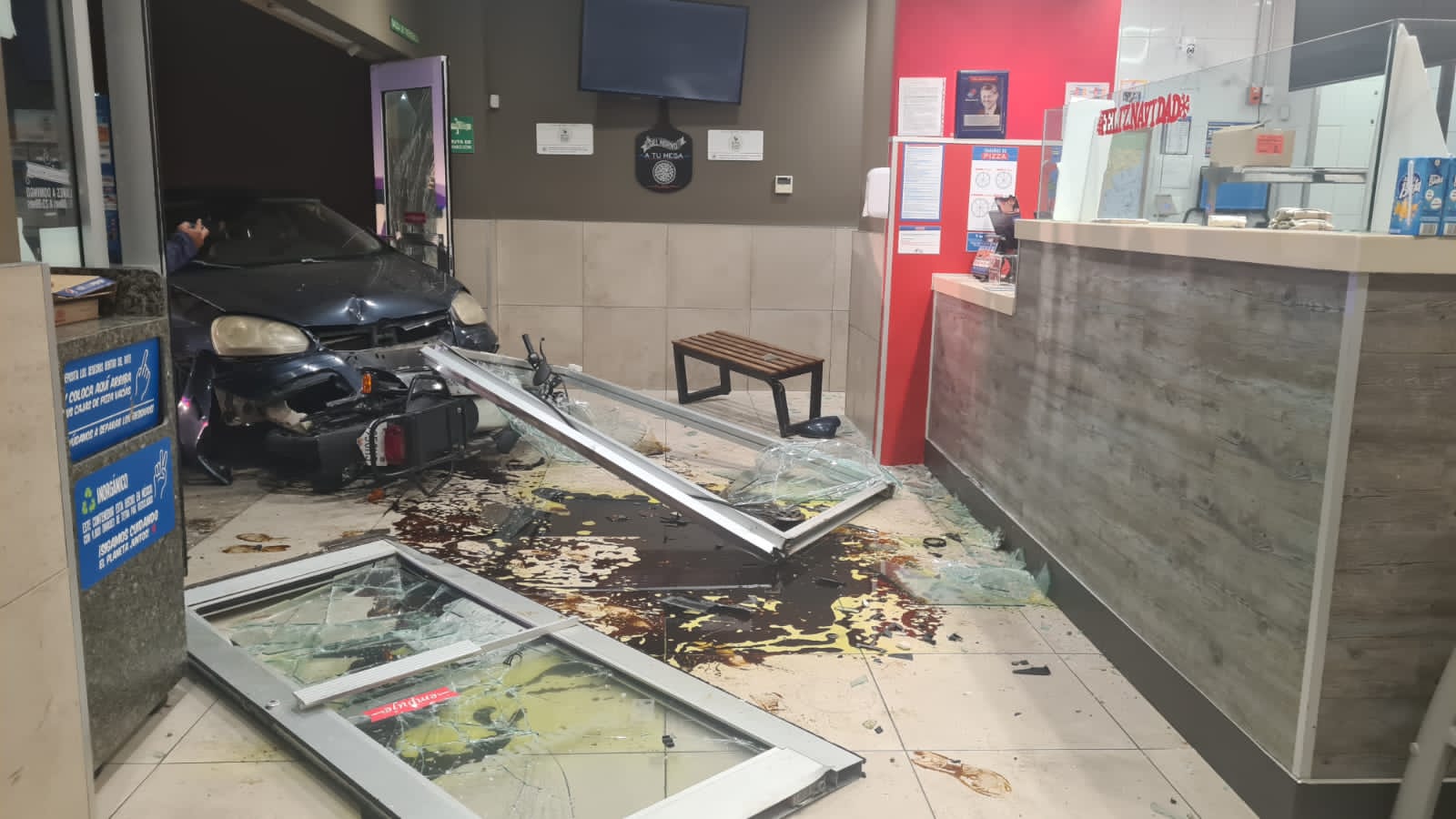 Primeras versiones refieren que el conductor transitaba a exceso de velocidad cuando, al no alcanzar al frenar su vehículo, terminó chocando contra la hilera de motos estacionadas, para luego romper parcialmente la fachada de cristal del establecimiento.