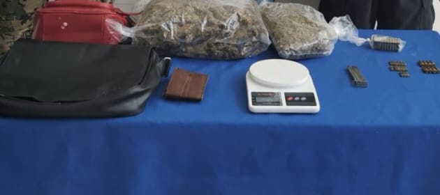 Asimismo se le encontró una bolsa mediana con hierba seca con características a la marihuana; una bascula; un porta cartuchos, así como un cargador y 73 cartuchos en el