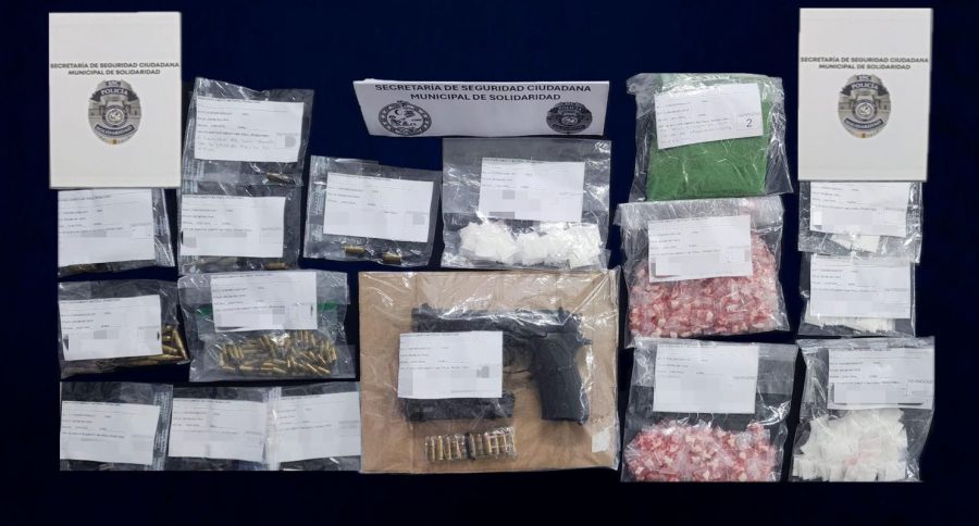 Tras una inspección fueron asegurados un arma de fuego, 65 cartuchos útiles, 307 envoltorios con posible metanfetamina y 141 con lo que parece cocaína.
