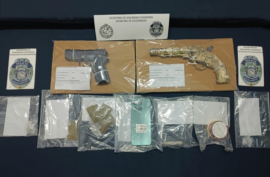 Estos sujetos tenían 4 dosis de marihuana, 5 de cristal, una réplica de arma de fuego, un arma tipo revólver y un bote con balines y un cilindro metálico.