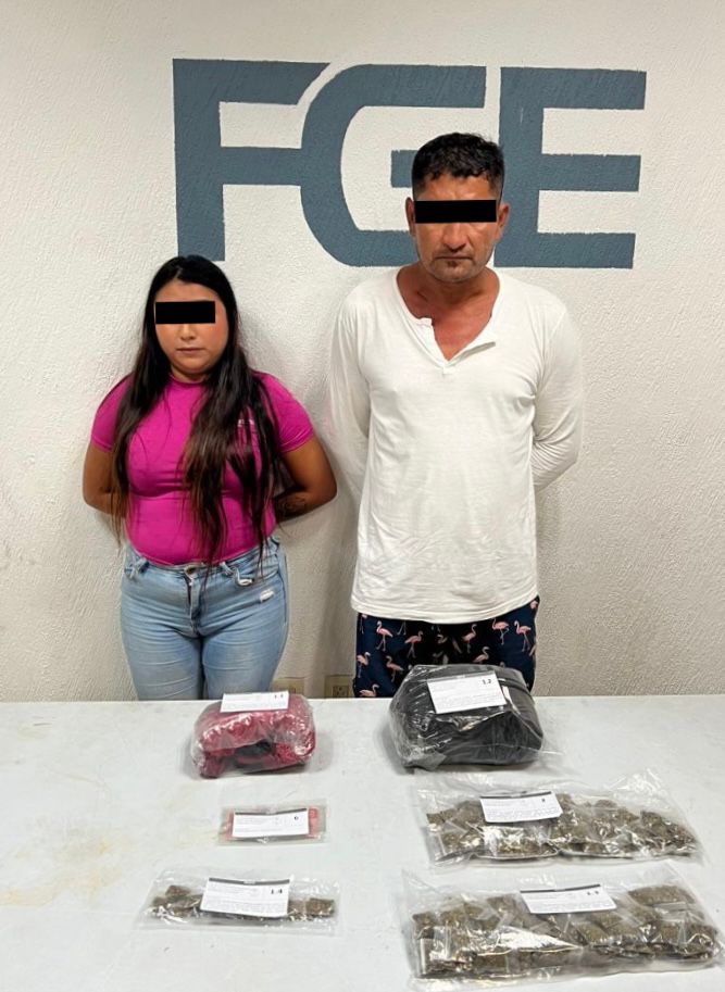 Por último, capturaron a David “N” y Ana Cristina “N”, en la intersección de las avenidas Benito Juárez y 145 Sur, frente a la colonia Bellavista; en la revisión les encontraron diversas dosis de hierba verde y seca con características propias de la droga conocida como marihuana.