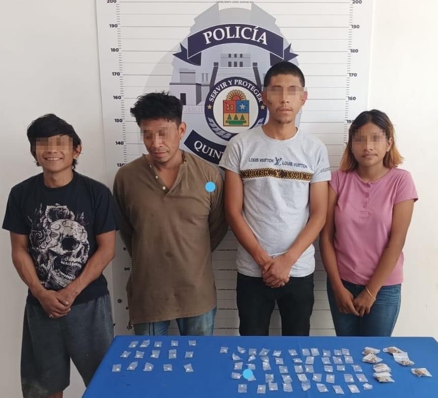 Cancún.-Oficiales de la Policía Quintana Roo Benito Juárez lograron la detención de tres masculinos y una fémina que se identificaron como Carlos “N” de 36 años, José “N” de 27 años, Enrique “N” de 23 años y Berenice “N” de 18 años de edad, por delitos contra la salud.