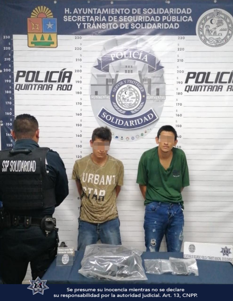 Playa del Carmen.- Como resultado del reforzamiento de los recorridos de vigilancia, policías de la Secretaría de Seguridad Pública y Tránsito Municipal de Solidaridad atendieron una solicitud de auxilio de una pareja y aseguraron a dos sujetos por el posible delito de robo en la colonia Colosio.