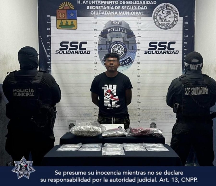 Playa del Carmen.- La Secretaría de Seguridad Ciudadana Municipal (SSCM) de Solidaridad detuvo a un hombre por la probable comisión de delitos contra la salud en la colonia Luis Donaldo Colosio, asegurándole 80 envoltorios con sustancias similares a narcóticos.