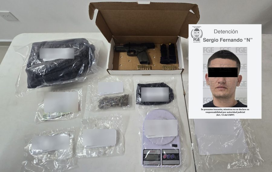 Benito Juárez.- La Fiscalía General del Estado, en coordinación con la Secretaría de la Marina y Guardia Nacional, detuvo en flagrancia, en este municipio, a una persona del sexo masculino, quien entre sus pertenencias tenía numerosas dosis de presuntos estupefacientes, así como un arma de fuego y cartuchos útiles.