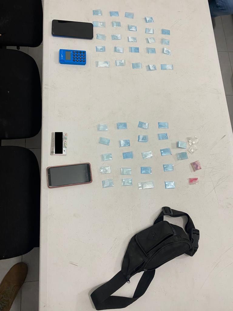 -46 bolsitas de material sintético transparentes de color azul cada una en su interior polvo de color blanco