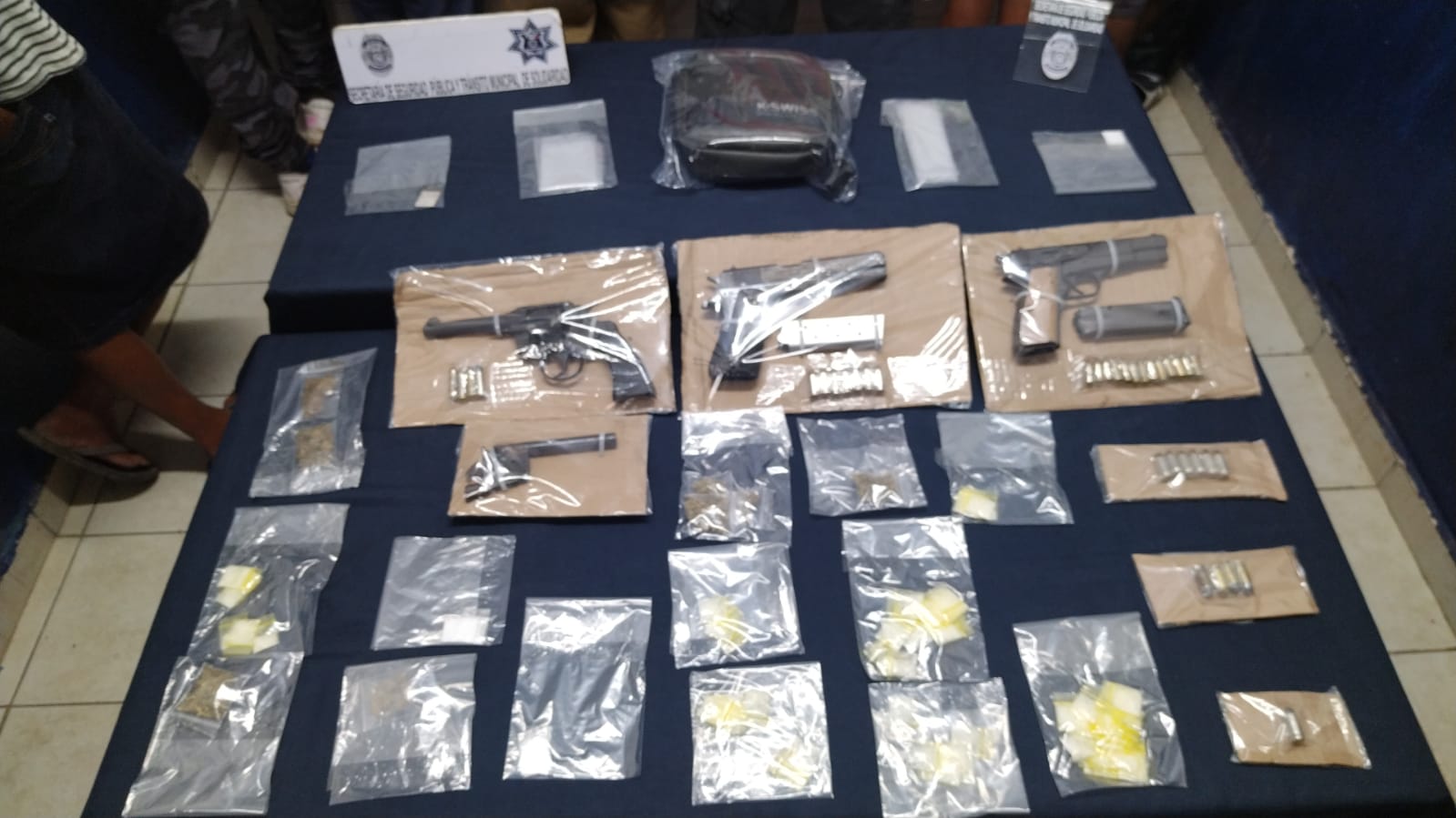 Luego de una inspección de seguridad los policías aseguraron 3 armas de fuego, 35 cartuchos útiles, 70 envoltorios con lo que parece la droga llamada cristal, 8 con posible marihuana y 8 con lo que parece cocaína, de igual forma en el lugar se encontraban 5 menores de edad que recibieron apoyo integral y protección del Grupo Especializado de Atención a la Violencia Familiar y de Género GEAVIG.
