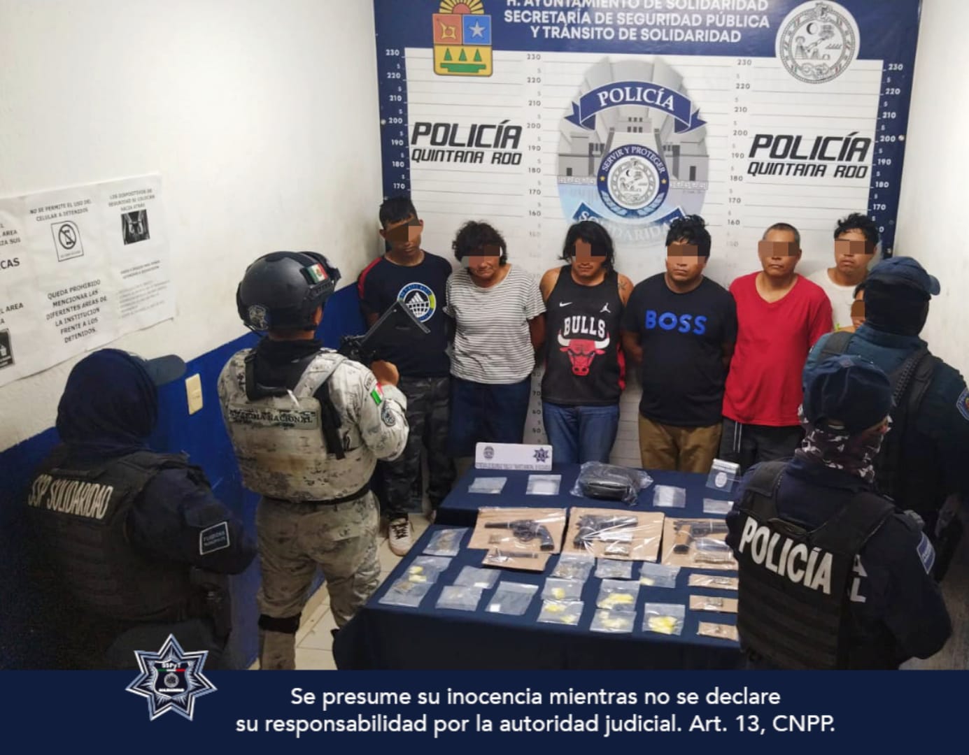 PLAYA DEL CARMEN.- En una acción efectiva durante el operativo de vigilancia de la Policía Municipal de Solidaridad en la colonia In House, fueron aseguradas 7 personas, 3 armas de fuego y 86 posibles dosis de narcóticos. Asimismo en otro hecho fue asegurada una mujer en la colonia Colosio con 86 envoltorios con posibles drogas.