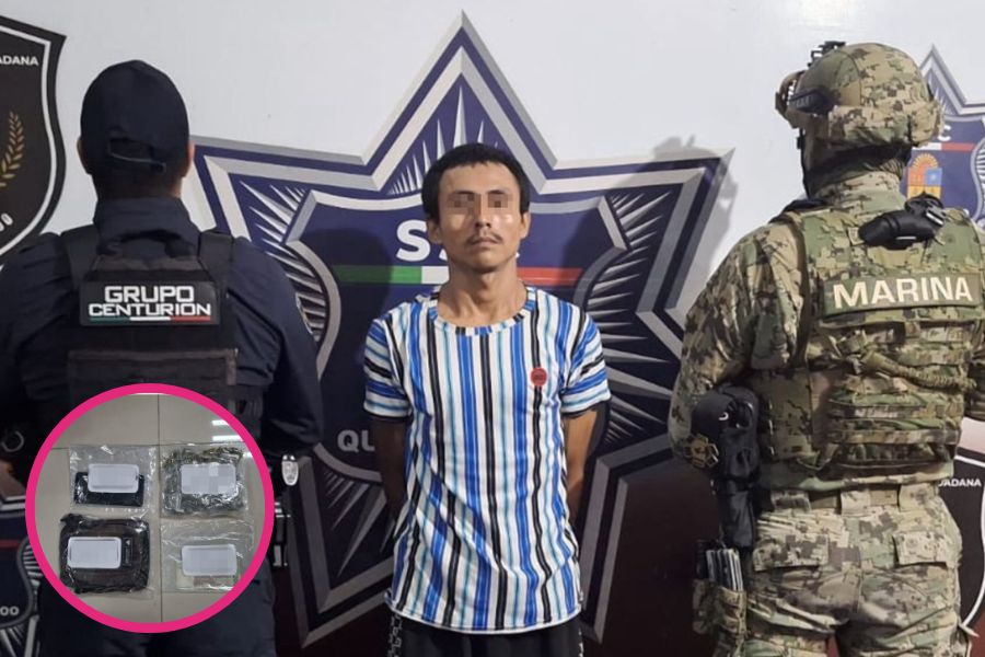 Cancún.- Un hombre fue detenido en posesión de presuntas sustancias ilegales durante un operativo de vigilancia realizado por uniformados estatales en coordinación con la Secretaría de Marina, en calles de la supermanzana 63 en Cancún.
