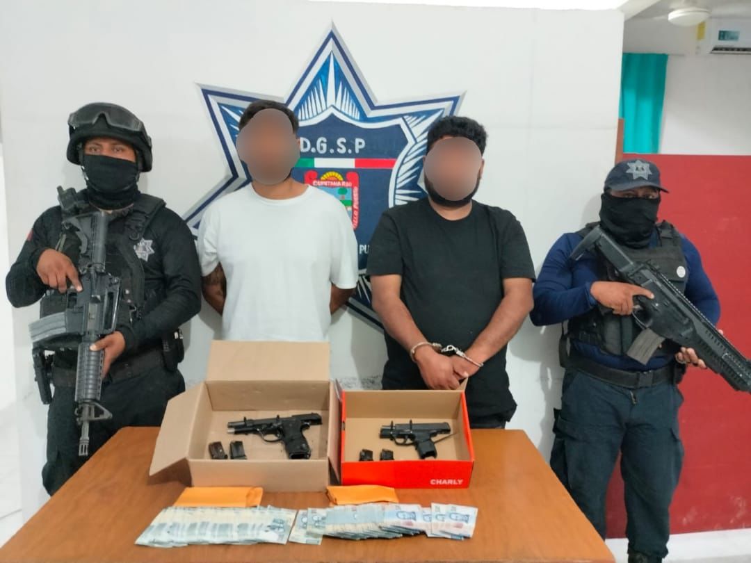 Tras ubicarlos y realizarles una revisión, los elementos policíacos les encontraron dos armas cortas; una abastecida con 10 y otra con cinco cartuchos útiles, así como dos cargadores con 9 cartuchos, dos celulares y, al parecer, 105 mil 550 pesos en efectivo.