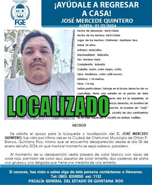 CHETUMAL.- José ‘N’, de 35 años de oficio es chofer de un autobús, fue hallado con vida después de haber sido reportado como desaparecido el pasado 3 de enero, en la capital del estado.