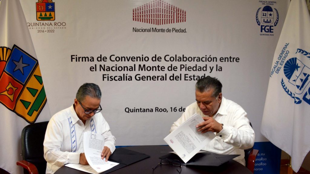 CANCÚN.- La Fiscalía General del Estado de Quintana Roo firmó un convenio de colaboración con el Nacional Monte de Piedad con el fin de acceder a información sobre empeños sospechosos u objetos de dudosa procedencia que llegan hasta la institución dedicada a operaciones prendarias.