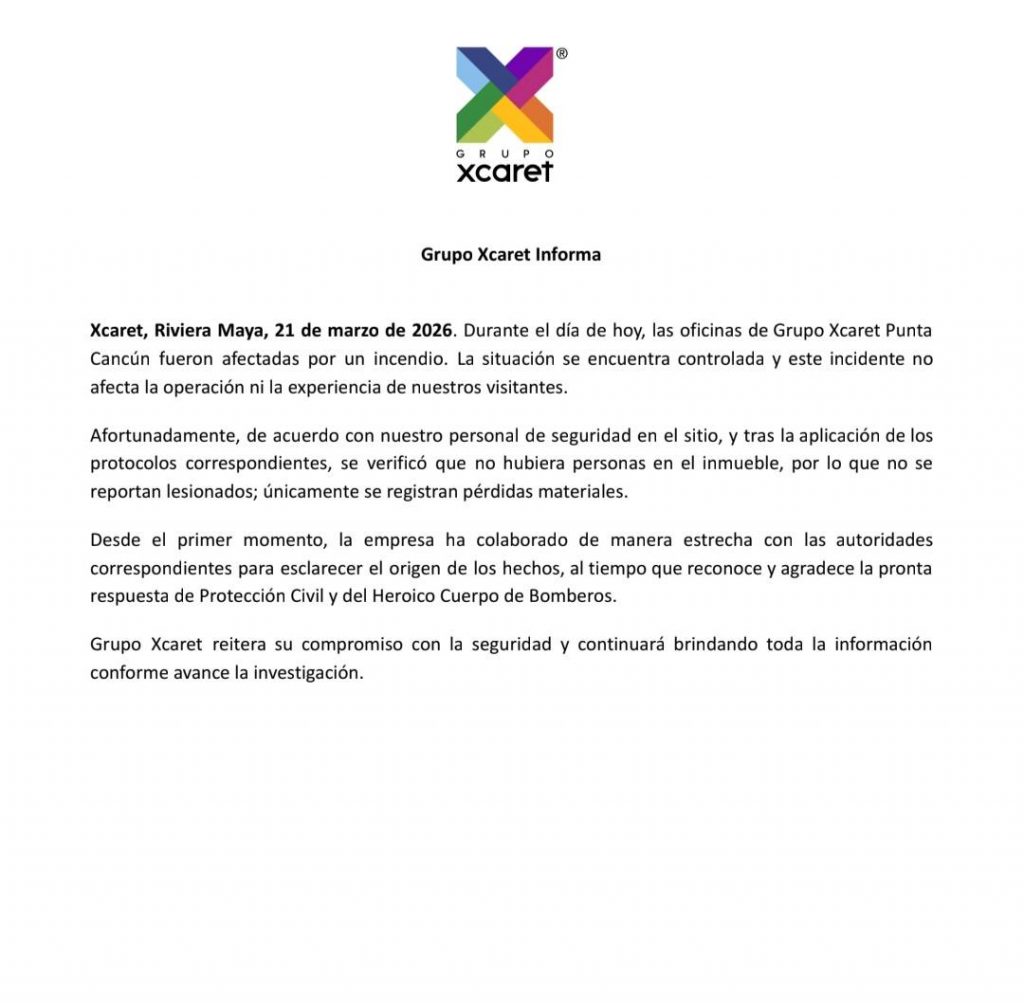 Cancún.- Grupo Xcaret confirmó que la situación en sus oficinas de Punta Cancún se encuentra totalmente bajo control y que, tras activar los protocolos de seguridad, se verificó que no existen personas lesionadas, registrándose únicamente daños materiales.
