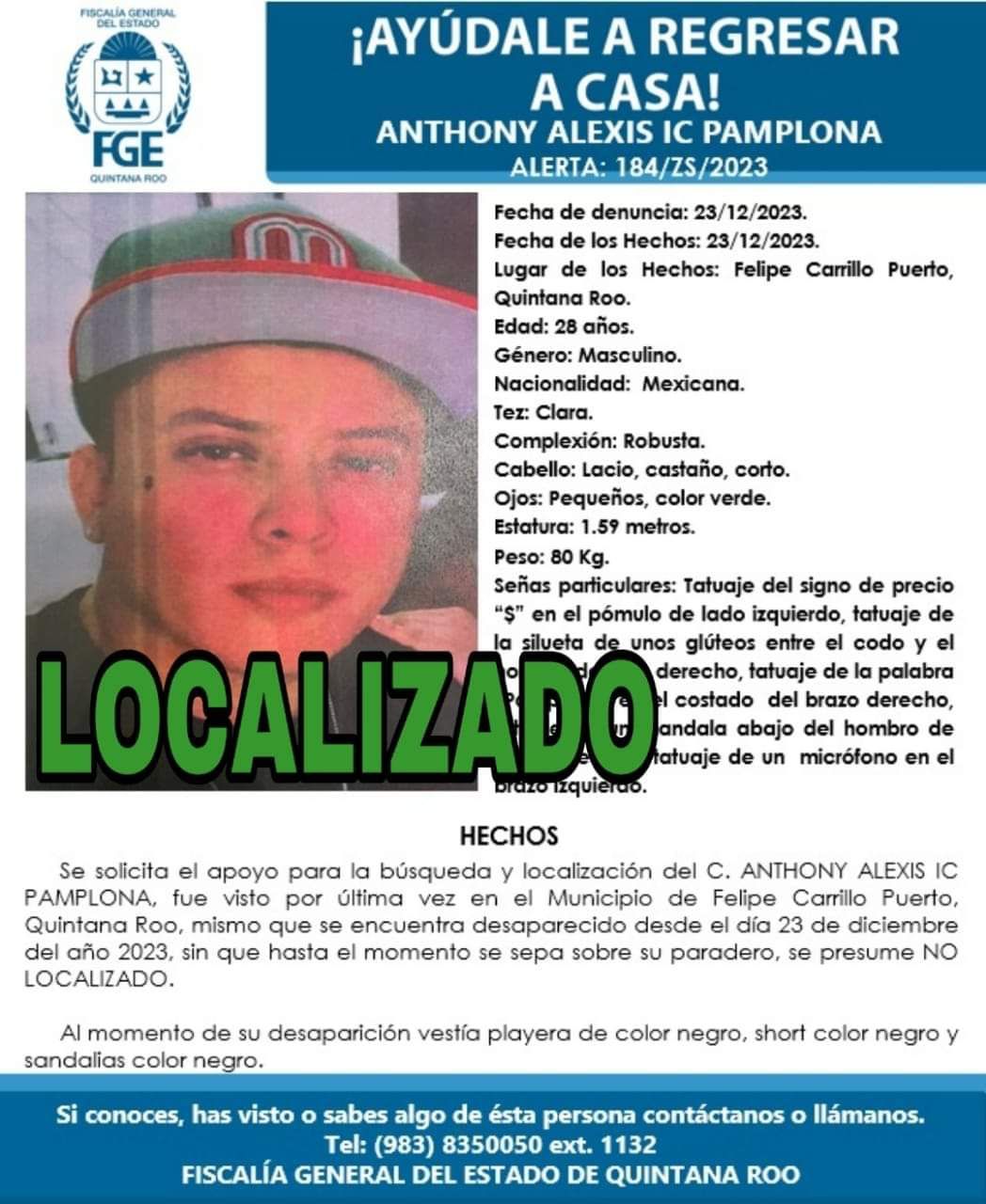 FELIPE CARRILLO PUERTO.- Anthony Alexis Ic Pamplona de 28 años, quien fue privado de su libertad la madrugada del sábado en esta ciudad, fue localizado con vida y se encuentra ya con sus familiares.