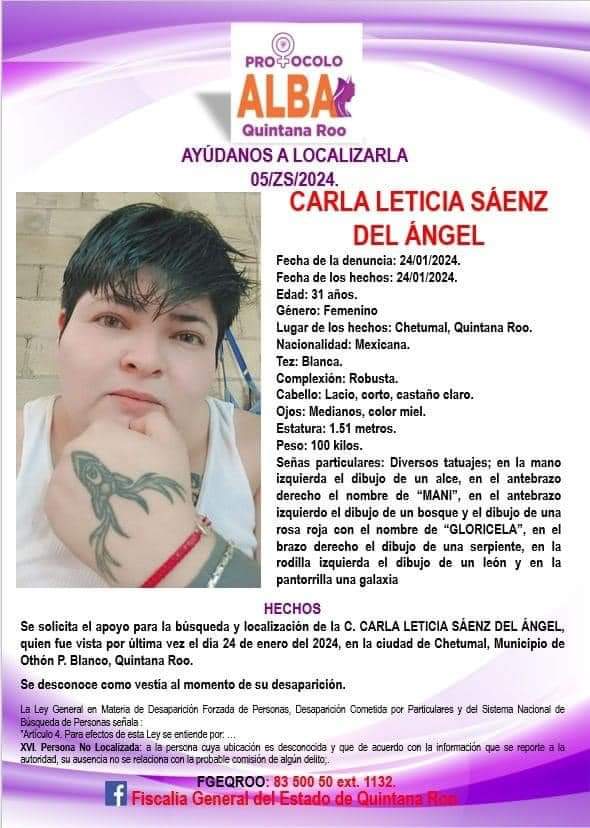 En cambio, la Fiscalía General del Estado, a las pocas horas de este hecho, publicó una ficha de búsqueda de la mujer que fue levantada, identificándola como Carla Leticia, en cuyo cuerpo tiene dos tatuajes, uno con el nombre “Mani” y otro con el de “Gloricela”.