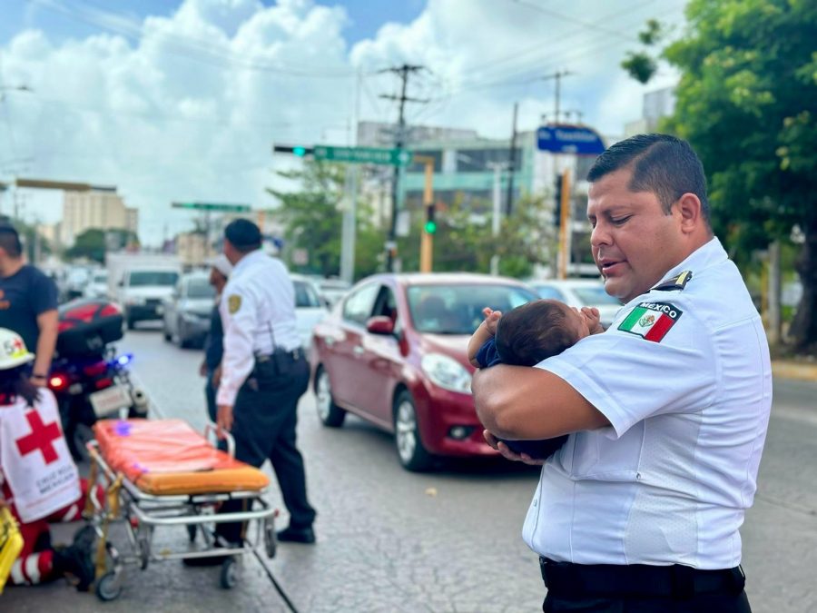 CANCÚN.- Un oficial adscrito a la Dirección de Tránsito Benito Juárez, resguardó a un bebé durante un hecho de tránsito que se registró en el centro de la ciudad.