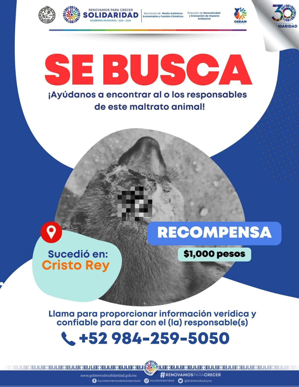 Según la publicación, se ofrece una recompensa de mil pesos a quien proporcione información verídica sobre los responsables del acto de crueldad animal que se suscitó en la colonia Cristo Rey y denunciarlo ante las autoridades.