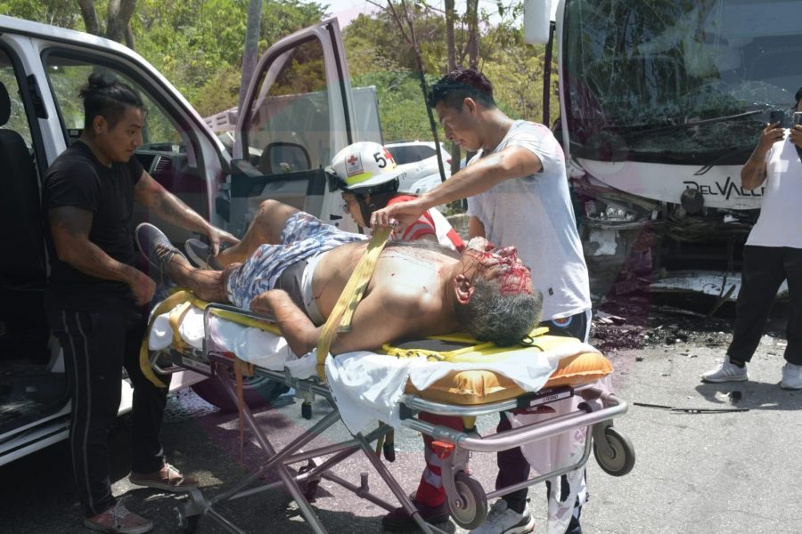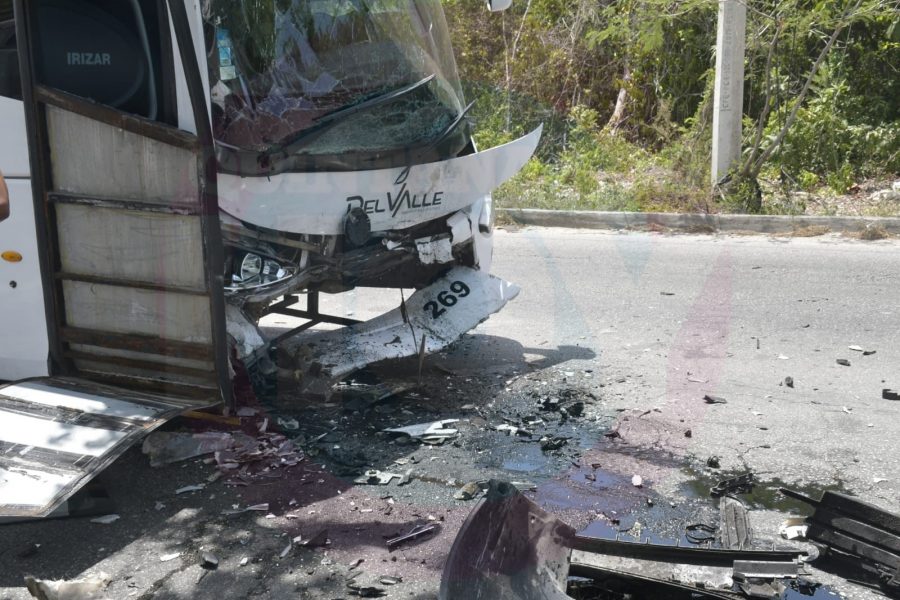 El accidente se produjo en la avenida Periférico de Cancún, a la altura del fraccionamiento Vista Real, en la Región 252, donde se podía ver un autobús del Valle y una Van con graves daños.