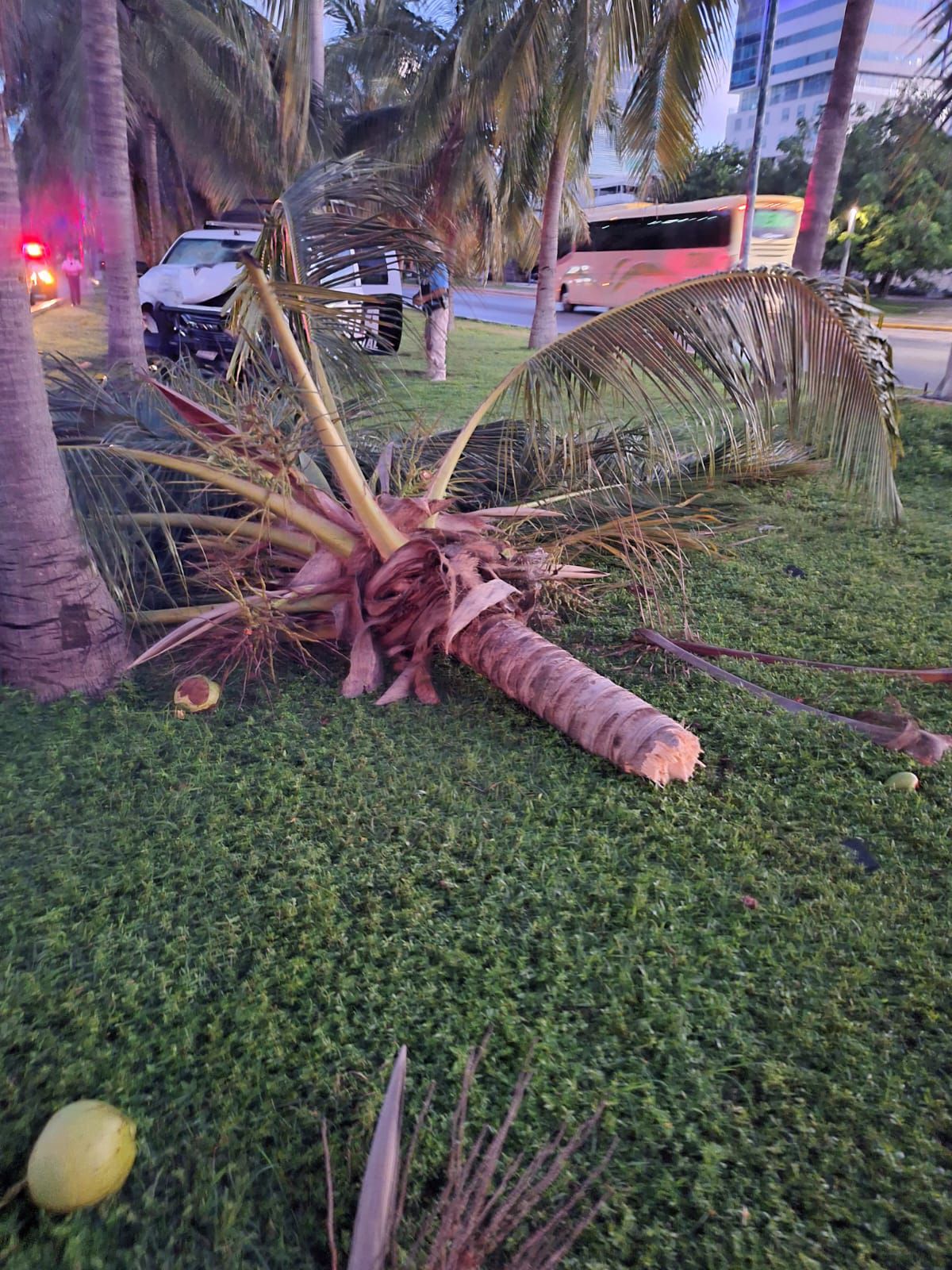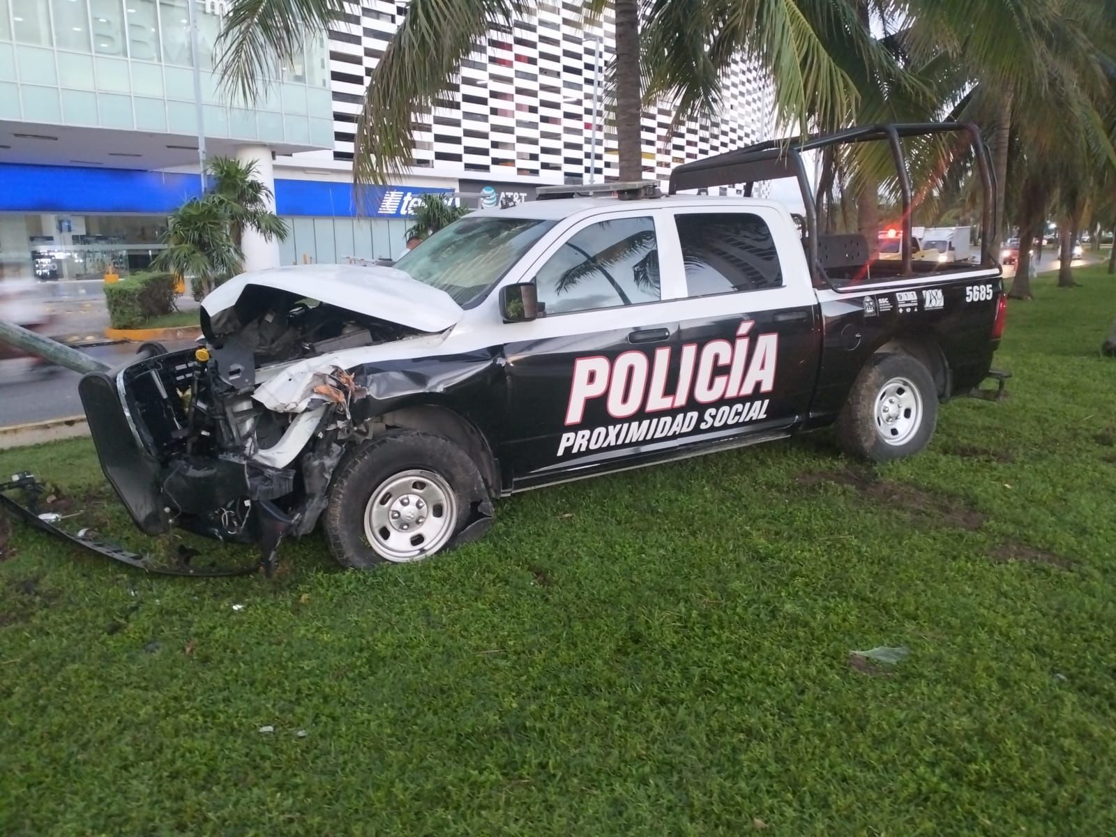 El incidente ocurrió cuando el conductor de la patrulla, identificado como el oficial Francisco C. C., de 36 años, originario de Tabasco, perdió el control de la unidad número 5551 y de marca Dodge Ram, al transitar de norte a sur en una vía mojada, lo que provocó que se deslizara hacia la izquierda, impactando contra un poste de alumbrado público y, posteriormente, una palmera, donde finalmente se detuvo.