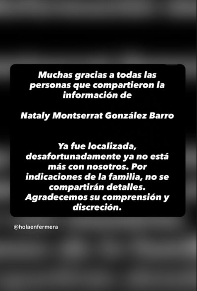 Nataly era prima de Itzel Barro, creadora de contenido conocida como “Hola Enfermera”, lo que permitió que su ficha de búsqueda se difundiera rápidamente en redes sociales, sumando miles de compartidos y llamados de apoyo ciudadano para dar con su paradero.