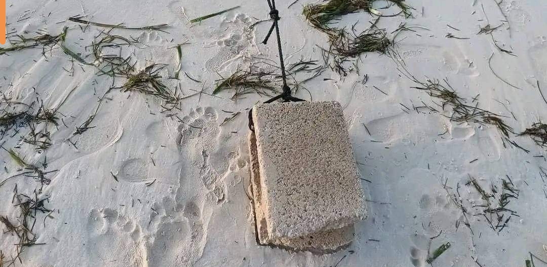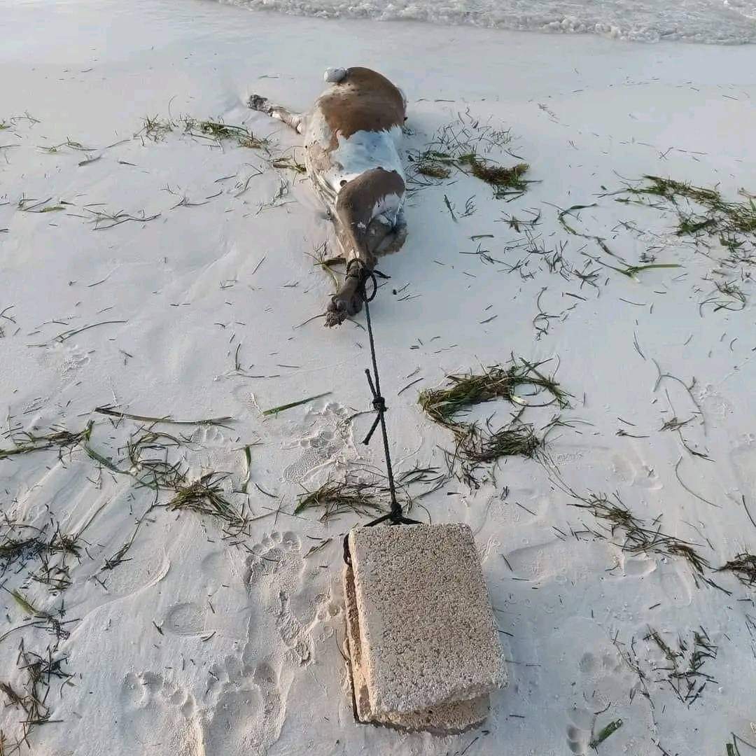 De manera preliminar se informó que un can fue arrojado al mar con un bloque de cemento amarrado en una de sus patas, recalando muerto atorado en una boya de la playa centro de Isla Mujeres.