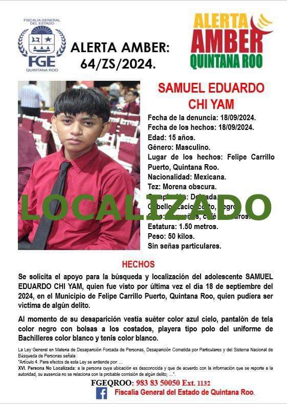 FELIPE CARRILLO PUERTO.- El menor de 15 años, que ayer fue reportado como desaparecido, regresó por su propia cuenta a su domicilio durante la madrugada de este jueves en Felipe Carrillo Puerto.