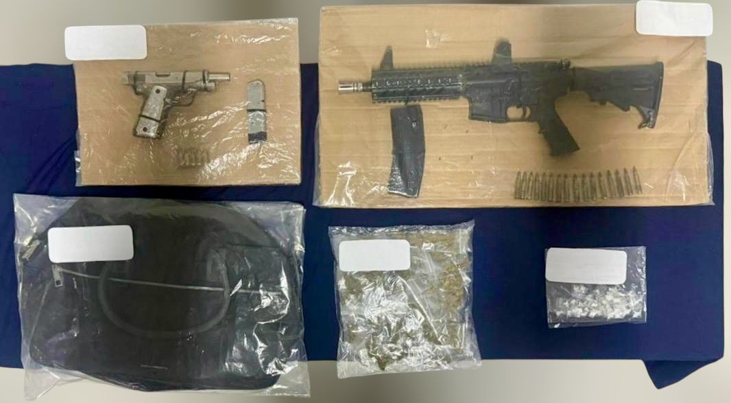 Entre lo asegurado destaca un rifle calibre .223 con 16 cartuchos. También una pistola calibre .45 con cinco municiones. Se confiscó una motocicleta sin placas y una maleta.