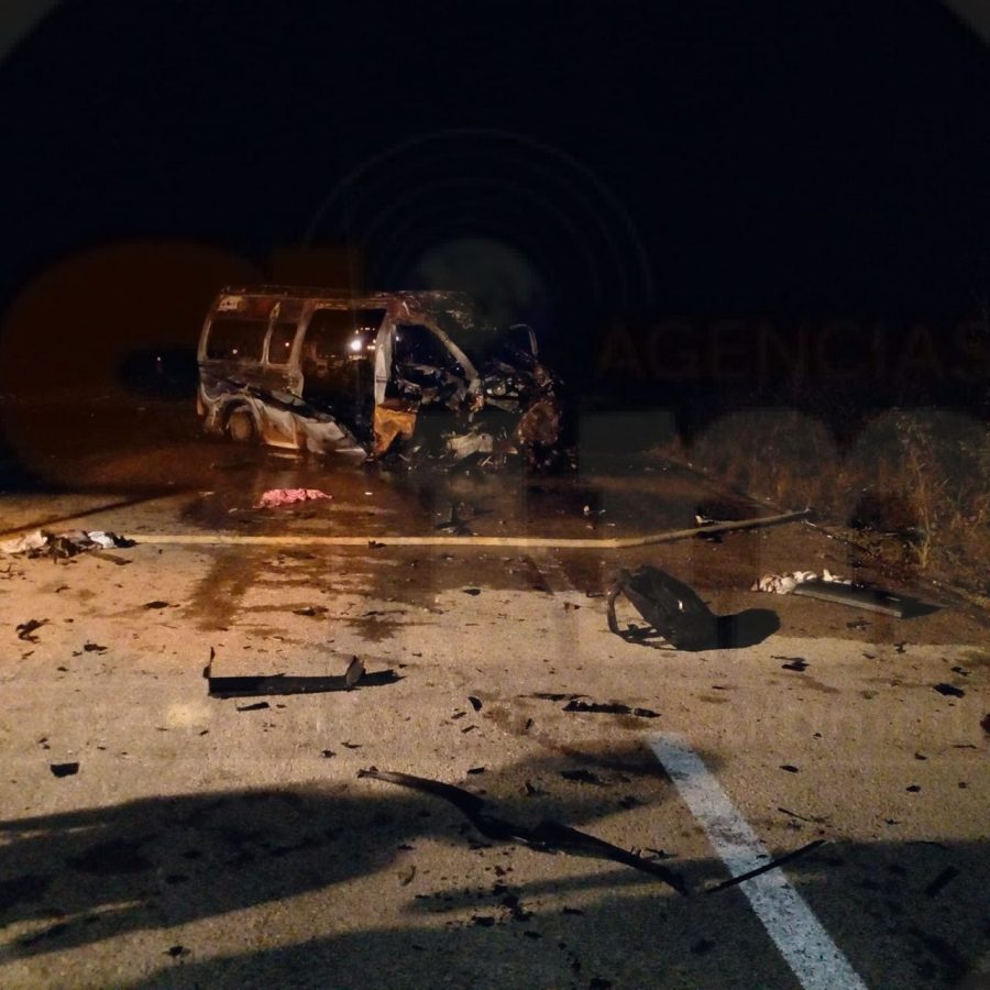 Eran las 4 de la mañana cuando esta van de transporte interurbano fue comisionada de frente por un tráiler que se cruzó al carril contrario, por haberse dormido su chófer o salido de control, a altura del entronque de la carretera federal con el acceso a X-Hazil Sur.