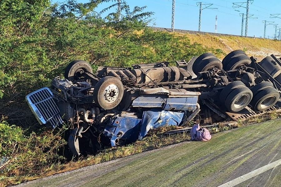 Un tráiler cargado con frutas y verduras volcó en la carretera federal 307, cerca de Felipe Carrillo Puerto; el conductor resultó ileso.