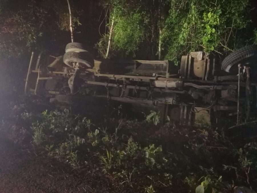 Un vehículo tipo volquete fue encontrado fuera de la cinta asfáltica, aproximadamente cuatro metros dentro de la maleza, recostado sobre su lado izquierdo.