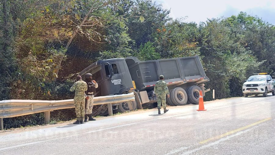 Felipe Carrillo Puerto.- Por un presunta falla mecánica, un camión de volteo del Ejército Mexicano volcó esta mañana en el tramo Felipe Carrillo Puerto-Chetumal de la carretera federal 307, a las afueras de la cabecera de este municipio.