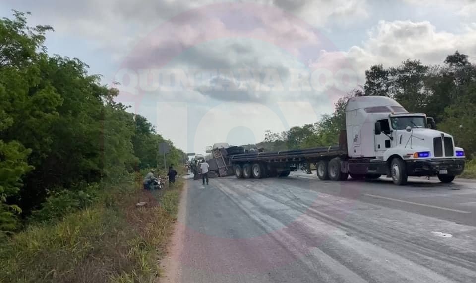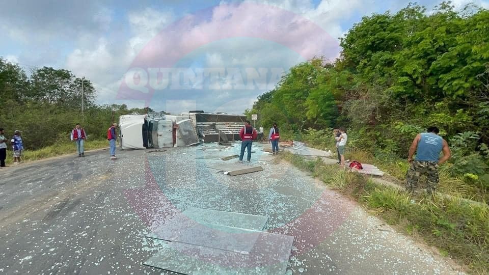 BACALAR.- Un camión tipo torton, que transportaba aproximadamente 10 toneladas en cristales, volcó esta mañana en el tramo carretero Chetumal-Bacalar, muy cerca del crucero que conduce al poblado de Buenavista. No hubo lesionados de gravedad.