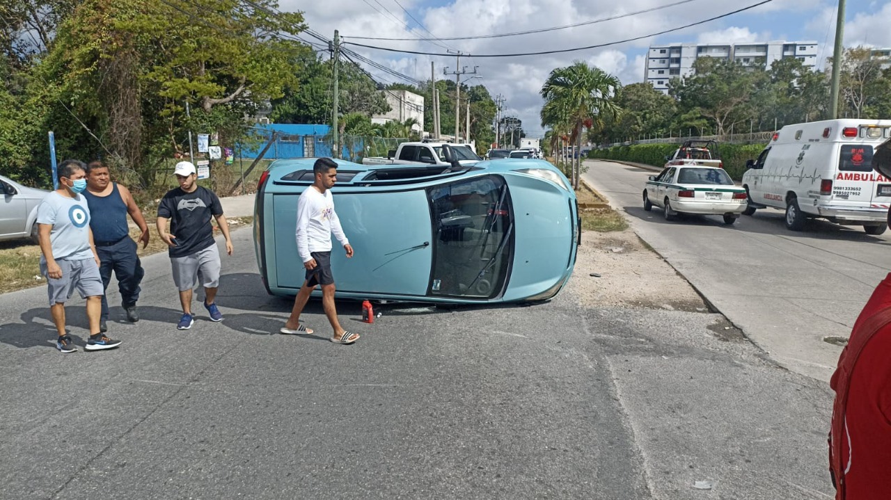 CANCÚN.-Se reportó la mañana de hoy una volcadura de un vehículo en la Supermanzana 510 en el cruce de las avenidas Politécnico con avenida México