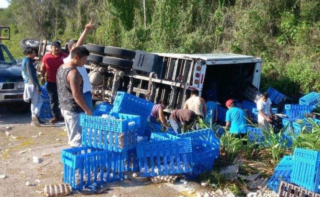 JOSÉ MARÍA MORELOS.- Un camión que transportaba más siete toneladas de huevos volcó en el tramo carretero José María Morelos-Polyuc, lo que ocasionó actos de rapiña por parte de pobladores.