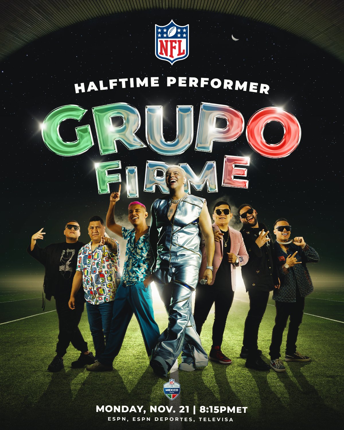 MÉXICO.- A través de sus redes sociales, la NFL dio a conocer que la agrupación de música regional mexicana, Grupo Firme participará en el medio tiempo del partido entre San Francisco y Los Cardinals.