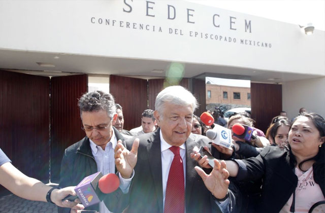 Apenas unos minutos antes de que ingresara el candidato del PRI, José Antonio Meade, a reunirse también en privado con los obispos, López Obrador resaltó en entrevista el papel que el Pontífice ha jugado en otros procesos de paz. “Él ha participado en procesos de reconciliación con los gobiernos de Cuba, Estados Unidos y Colombia para que haya paz y tranquilidad”.