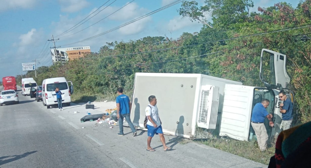 Alrededor de las 13:30 horas un camión de carga se volcó en la carretera federal en el tramo Puerto Morelos- Playa del Carmen a la altura del ranchito “Loma Bonita”. No se reportaron lesionados.