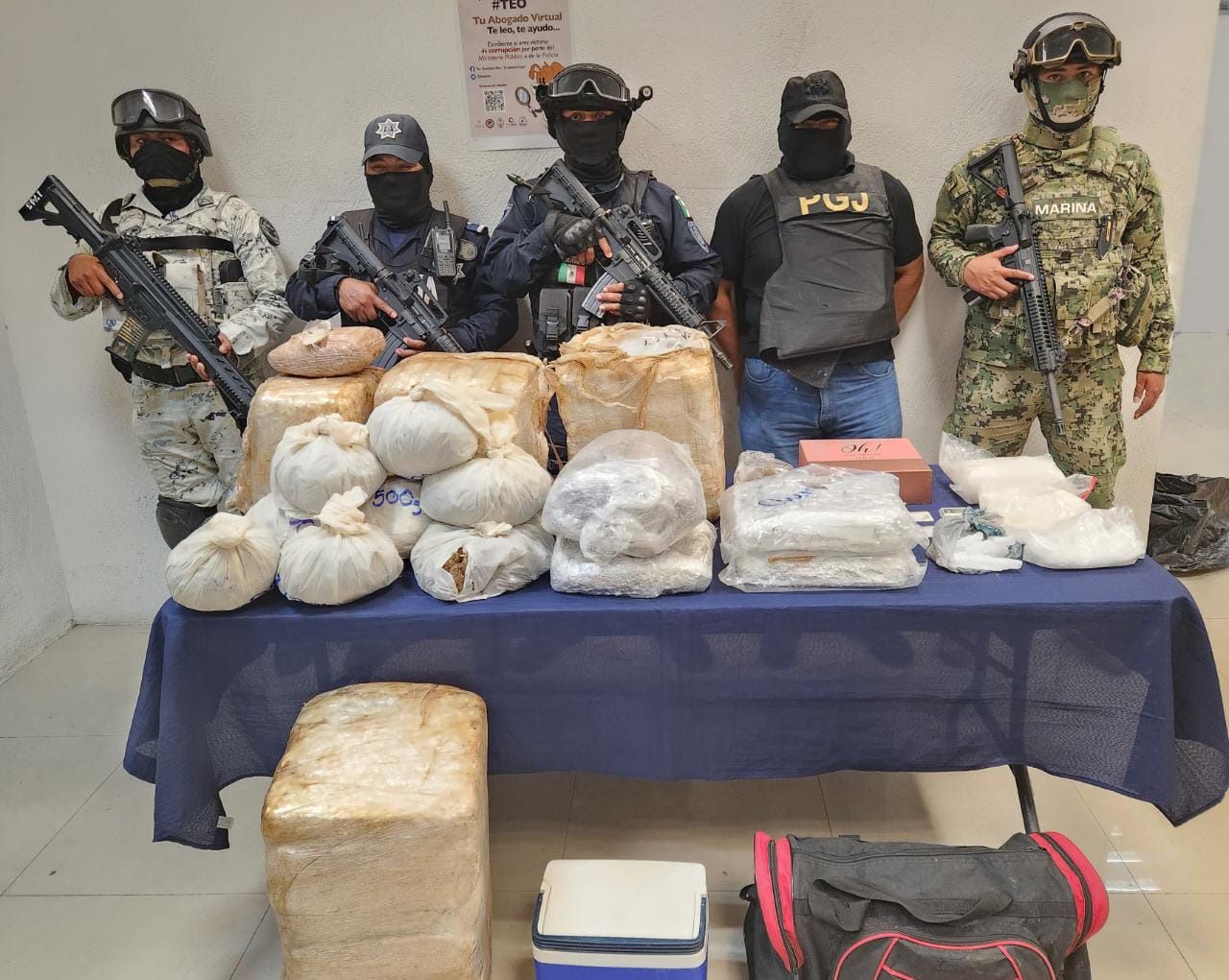 Tras solicitar a un juez de control el mandamiento judicial, agentes de la Policía de Investigación, en conjunto con el Grupo de Coordinación para la Construcción de Paz y Seguridad Quintana Roo, que preside la Gobernadora Mara Lezama, cumplimentaron la orden y aseguraron 38 paquetes de diferentes tamaños de marihuana, tres paquetes con fragmentos de características similares al cristal y una bolsa con material blanco similar a la cocaína.
