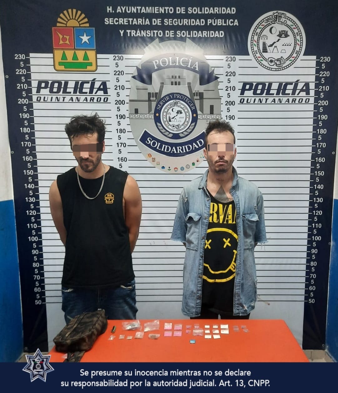 Playa del Carmen.- Policías de Solidaridad, aseguraron a dos sujetos en posesión de posibles narcóticos como marihuana, cocaína, LSD, cristal y crack.