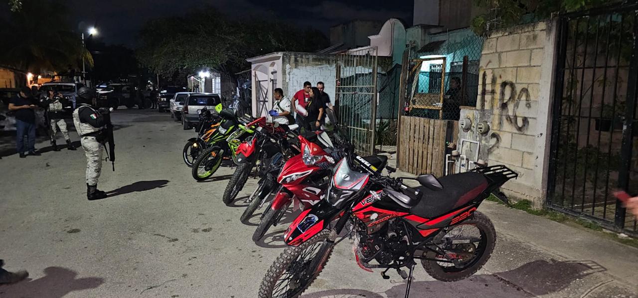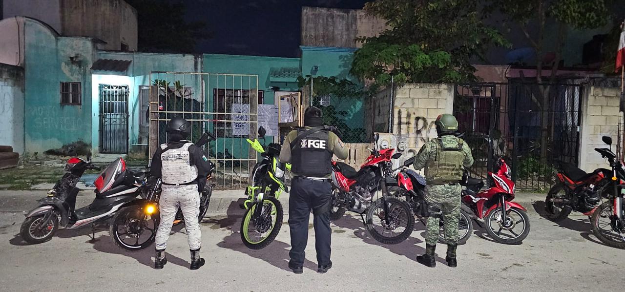 CANCÚN.– Siete motocicletas con reporte de robo vigente fueron aseguradas durante el cumplimento de una orden de cateo, girada por un Juez de Control, en un inmueble ubicado en este municipio, informó la Fiscalía General del Estado.