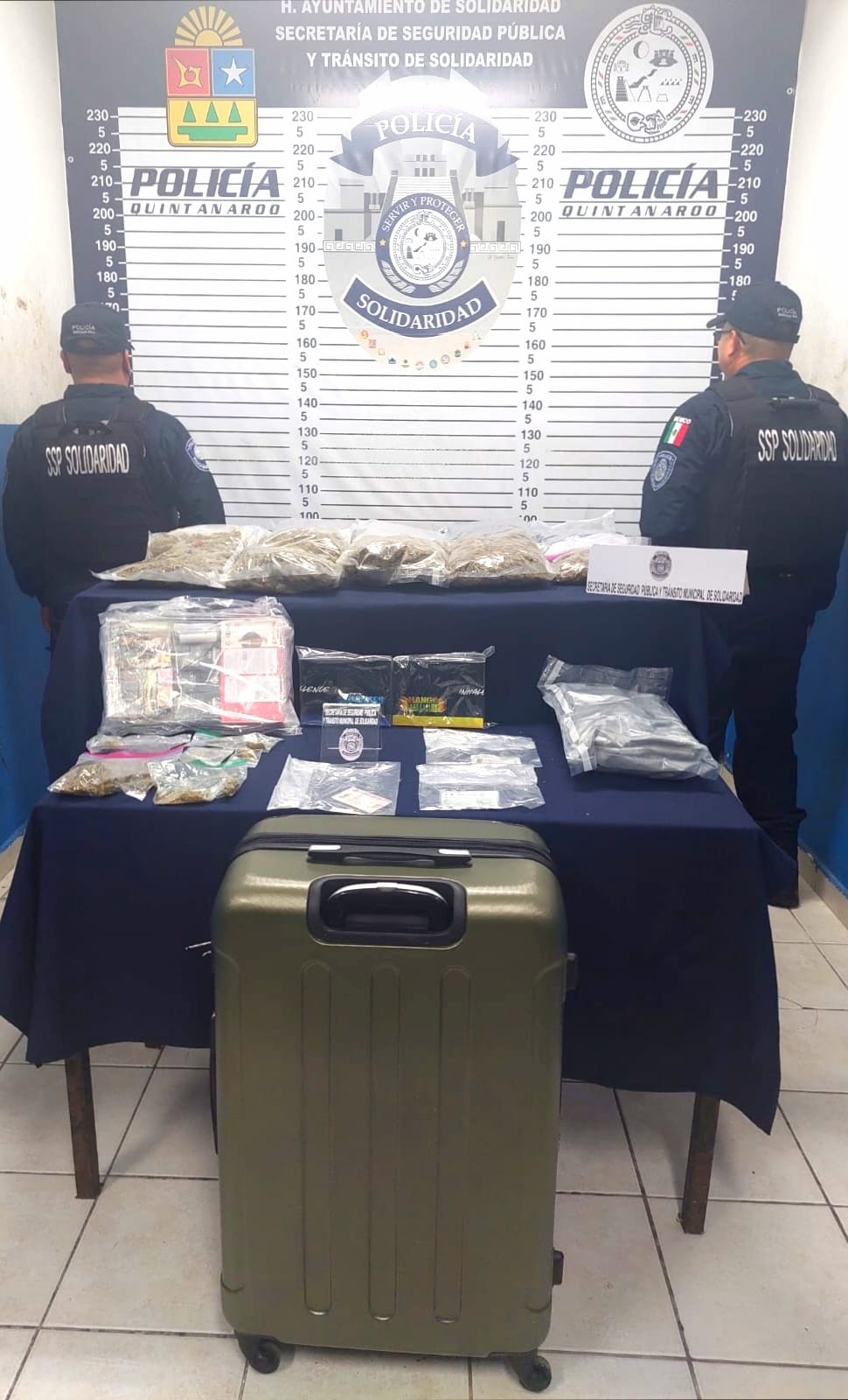 Playa del Carmen, Solidaridad.- Policías de la Secretaría de Seguridad Pública y Tránsito Municipal de Solidaridad aseguraron diversos narcóticos como marihuana, luego de una persecución a un vehículo en el fraccionamiento Paseo de los Olivos 2.